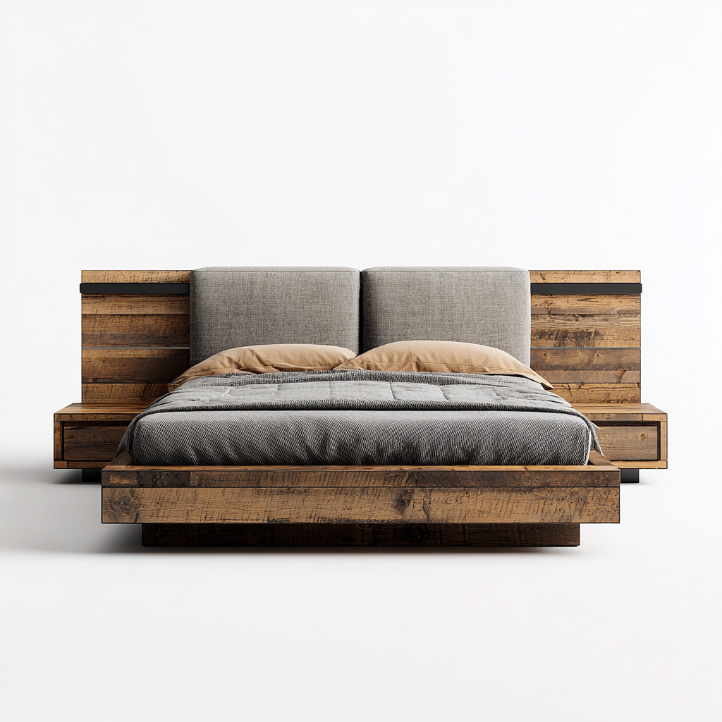 Dieses moderne Doppelbett kombiniert eine markante Holzstruktur mit weich gepolsterten Kopfteilmodulen. Das ausdrucksstarke Design verleiht dem Schlafzimmer einen warmen, zugleich zeitgemäßen Charakter und sorgt für hohen Schlafkomfort.