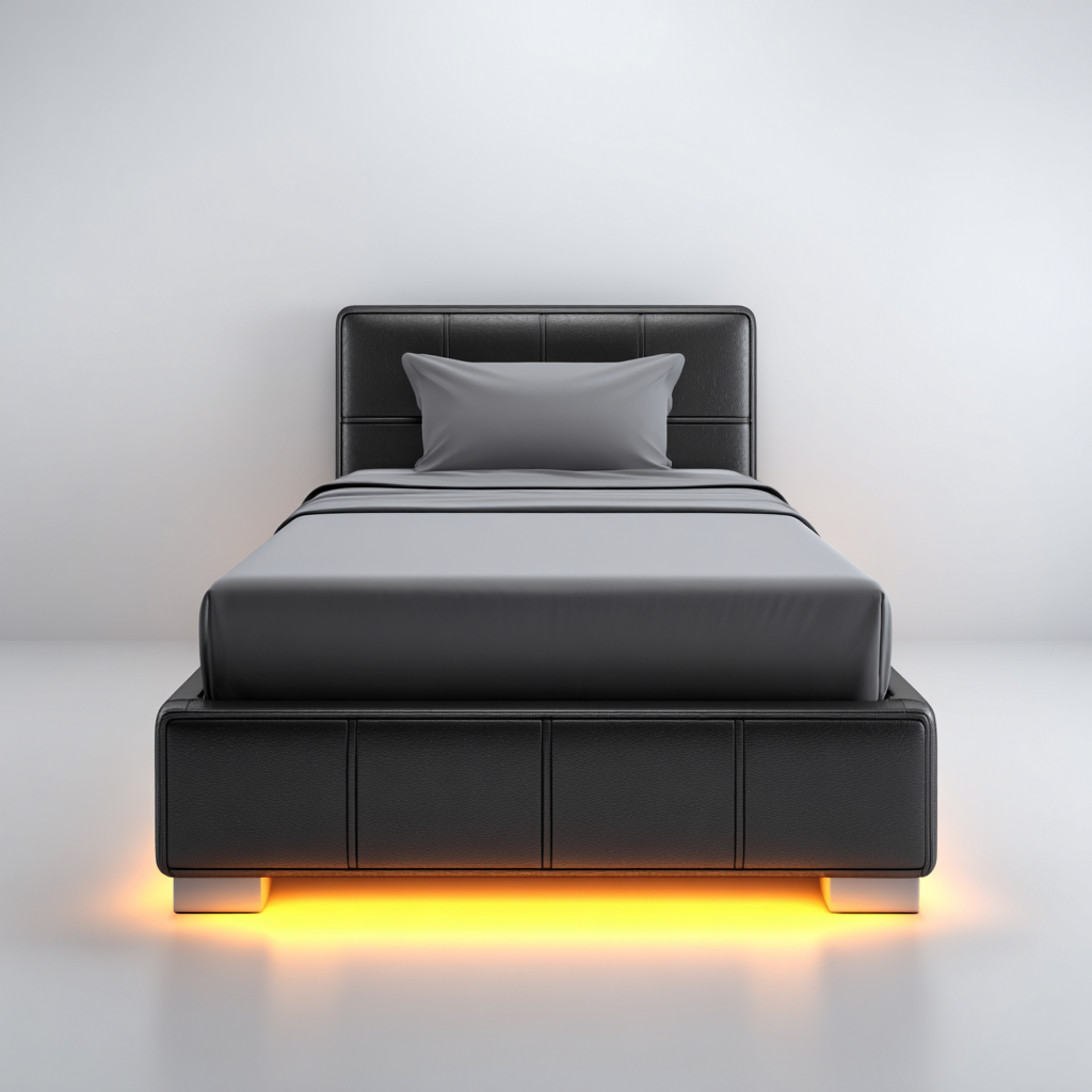 Das Bett verfügt über einen robusten Kunstlederbezug in Schwarz, der sich durch seine Strapazierfähigkeit und elegante Optik auszeichnet. Die LED-Beleuchtung am Bettrahmen sorgt für eine stimmungsvolle Atmosphäre und lässt sich nach Belieben anpassen.