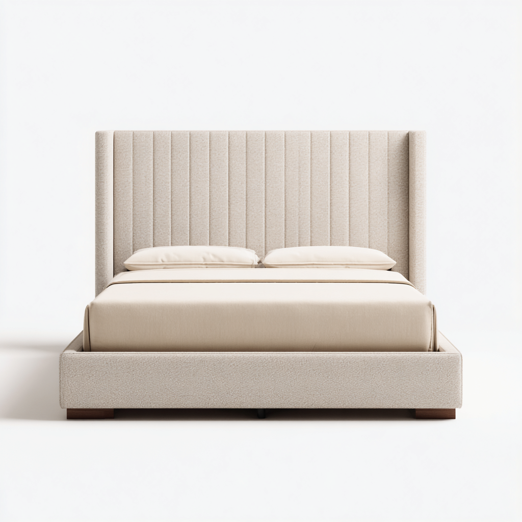 Dieses elegant gepolsterte Doppelbett präsentiert sich in einem modernen, klaren Design und bietet eine komfortable und stabile Schlafbasis. Das hohe Kopfteil mit vertikaler Struktur sorgt für eine stilvolle, beruhigende Optik.