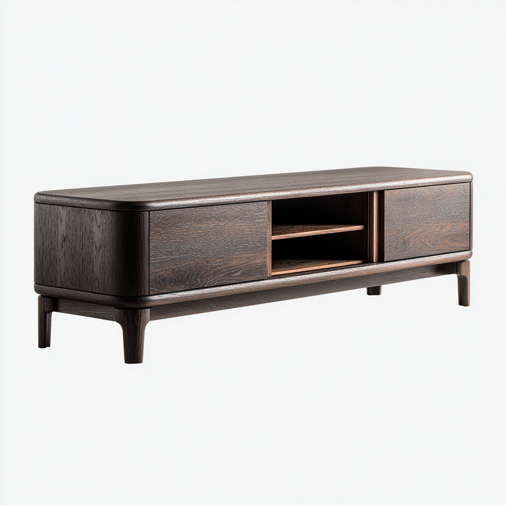 Das Lowboard besteht aus hochwertigem Holz mit dunkelbrauner Oberfläche. Die fein gearbeiteten Kanten und die stabile Konstruktion gewährleisten eine langlebige Nutzung.