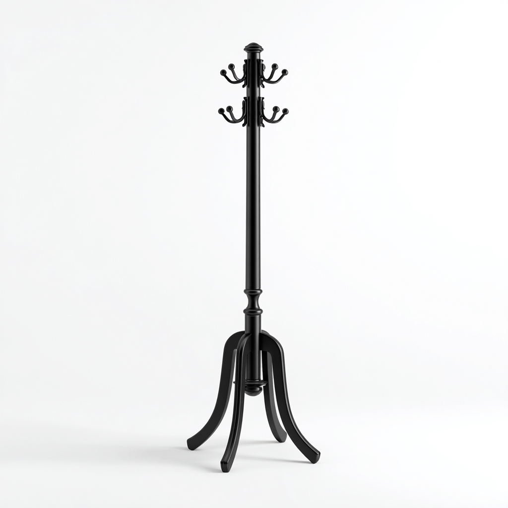 Der Garderobenständer bietet Haken für Jacken und Mäntel sowie eine stabile Basis, die Sicherheit und eine hohe Tragfähigkeit gewährleistet. Sein klassisches Design fügt sich nahtlos in jedes Zuhause ein.