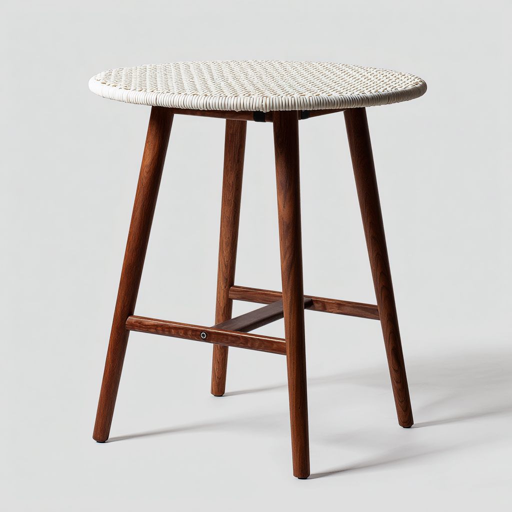 Dieser Gartentisch kombiniert eine geflochtene Tischplatte in Weiß mit einem stabilen Gestell aus Massivholz. Das kompakte Format eignet sich ideal für Balkone, Terrassen und kleine Außenbereiche.