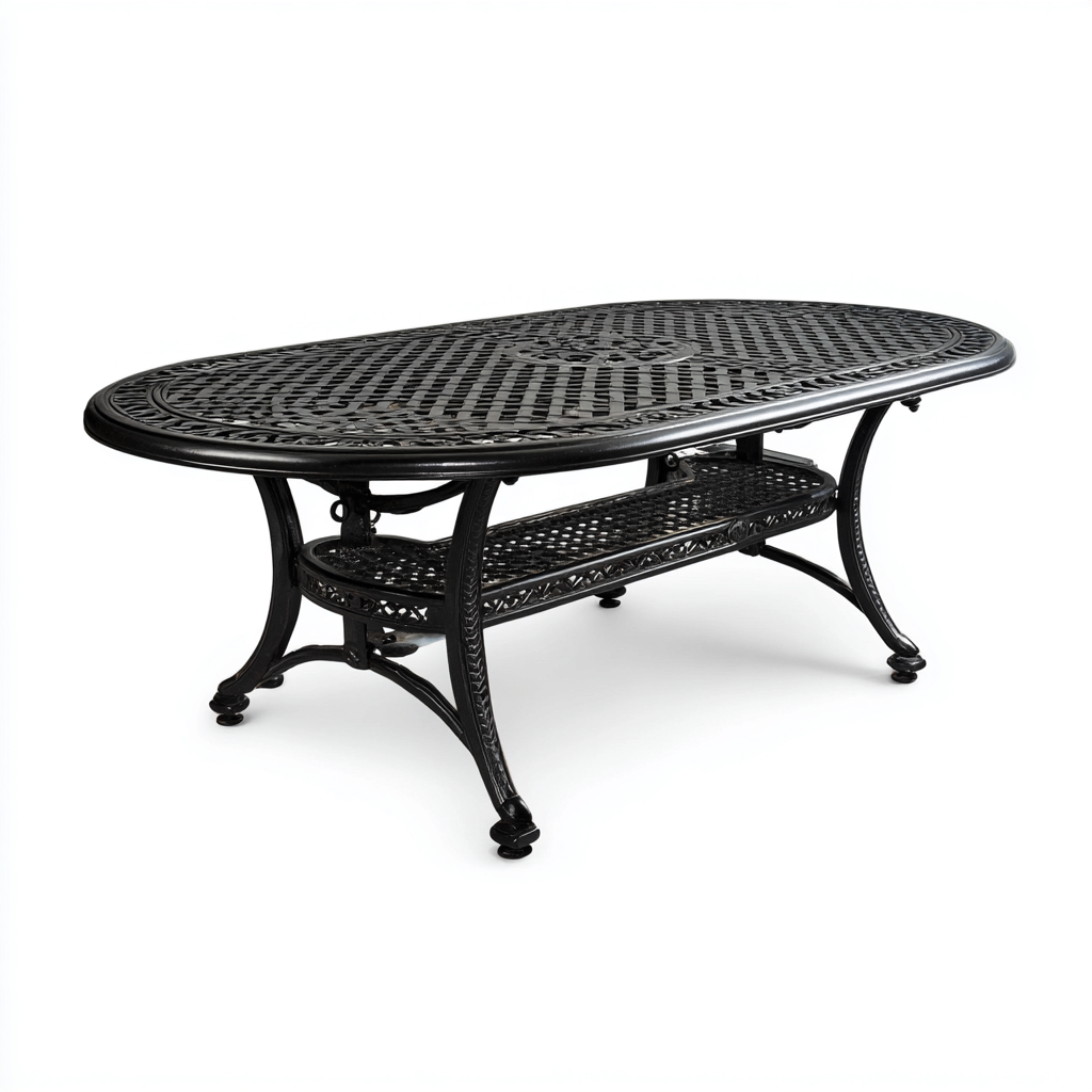 Die kunstvoll gearbeitete Tischplatte und das stabile Untergestell sorgen für eine elegante Optik und eine langlebige Nutzung im Garten, auf der Terrasse oder im Hof.