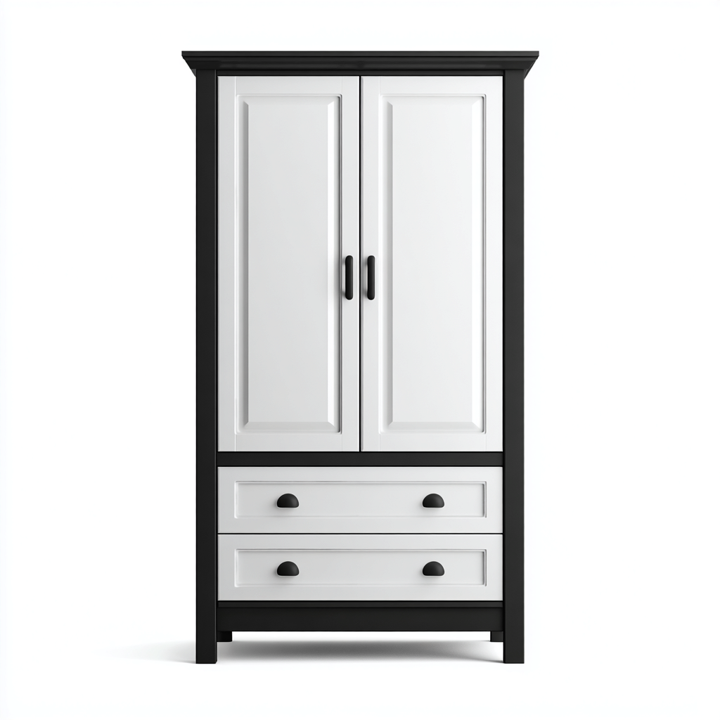 Der Schrank besteht aus robustem Holz mit einer eleganten weißen und schwarzen Farbkombination. Die Türgriffe und Schubladenknöpfe aus schwarzem Metall sorgen für einen modernen Akzent.