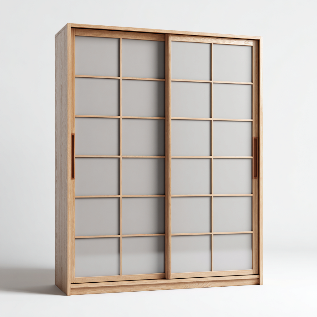Der Korpus besteht aus hellbraunem Holz mit natürlicher Maserung. Die zwei Schiebetüren verfügen über hellgraue Paneele, eingefasst in feine Holzstreben, die dem Schrank ein modernes und zugleich traditionell inspiriertes Erscheinungsbild verleihen. Die stabile Konstruktion sorgt für Langlebigkeit und zuverlässige Nutzung.