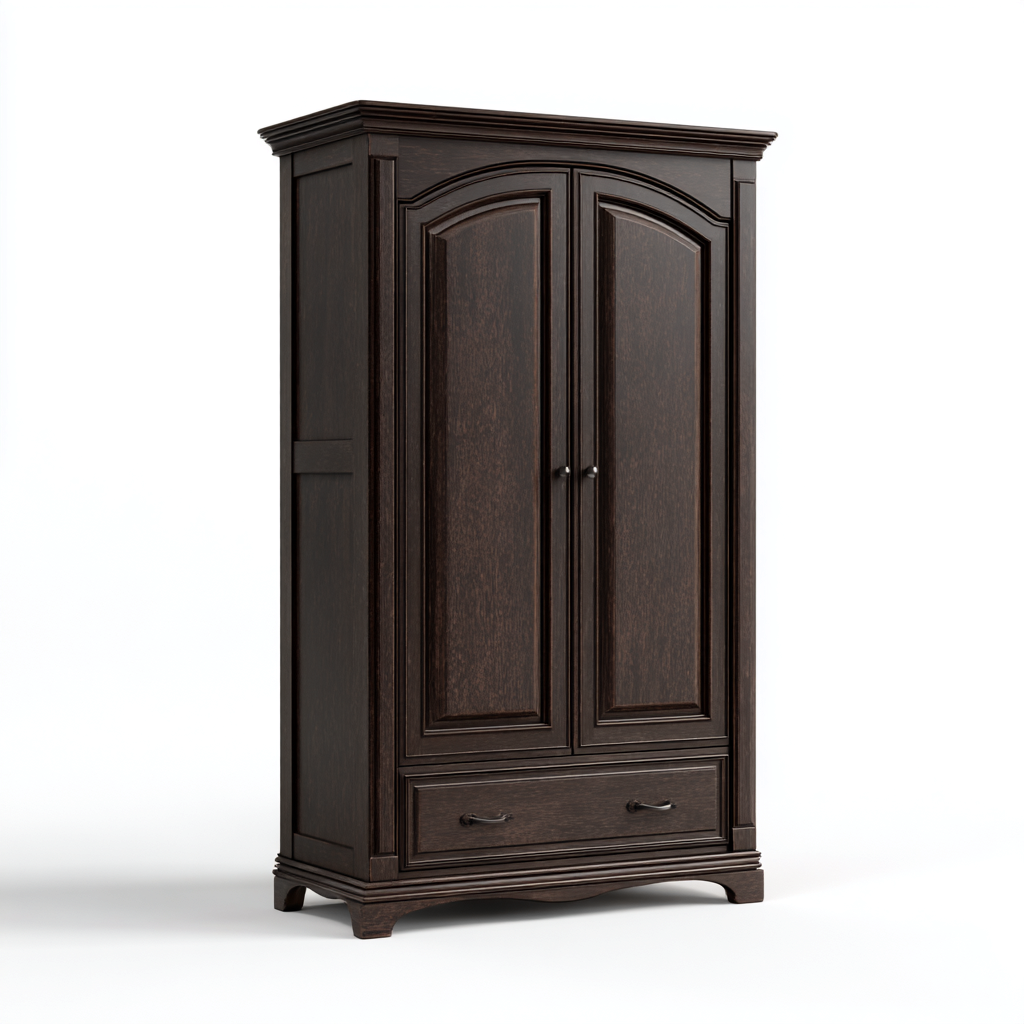Dieser Kleiderschrank aus dunkelbraunem Holz präsentiert sich in einem klassischen Stil und bietet eine elegante Aufbewahrungslösung für Wohn- und Schlafbereiche.