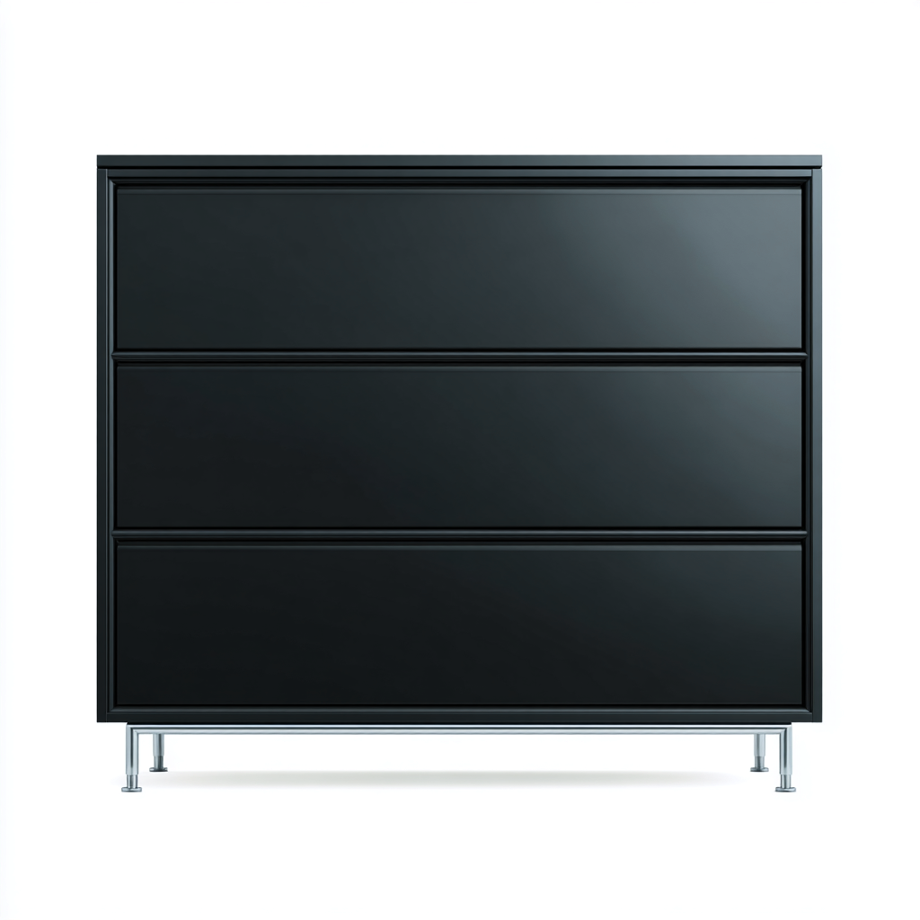 Diese Kommode mit Schubladen präsentiert sich in einem klaren, modernen Design mit vollständig schwarzer Front. Die reduzierte Formensprache macht das Möbelstück zu einer eleganten Ergänzung für Wohn-, Schlaf- oder Arbeitsbereiche.