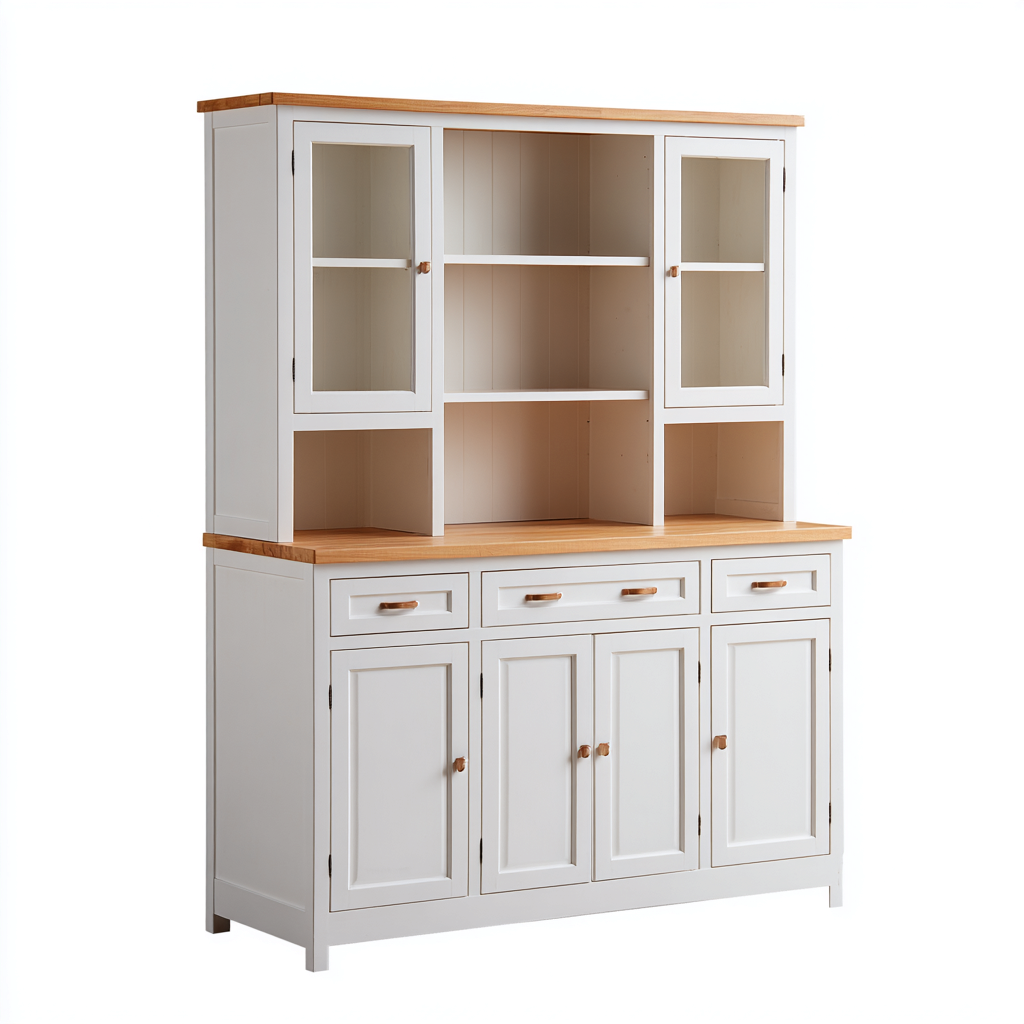 Das Möbelstück ist in einen unteren und einen oberen Bereich gegliedert. Unten befinden sich Türen mit großzügigem Stauraum, während der obere Bereich über Vitrinentüren und offene Fächer verfügt - ideal zur Präsentation oder zur ordentlichen Unterbringung von Küchenzubehör.