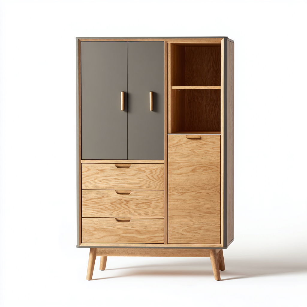 Der Schrank besteht aus hochwertigem Massivholz in hellholzfarbener Optik, kombiniert mit grauen Frontflächen. Die glatten Oberflächen sind pflegeleicht, während die Holzstruktur eine natürliche ästhetische Wirkung erzeugt.