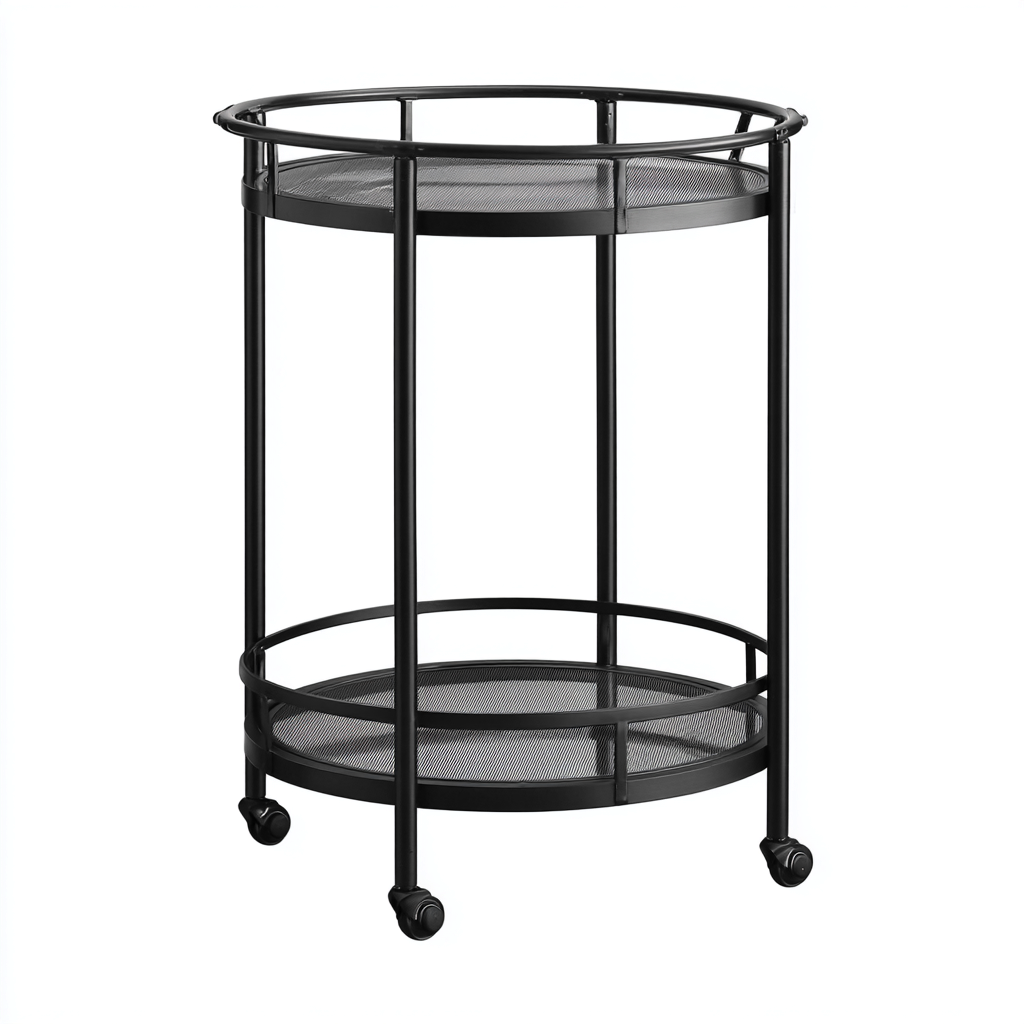 Gefertigt aus robustem Metall in schwarz präsentiert sich der Wagen mit einer stabilen Rahmenstruktur und fein gelochten Ablageflächen. Die hochwertige Verarbeitung gewährleistet eine langlebige und zuverlässige Nutzung.