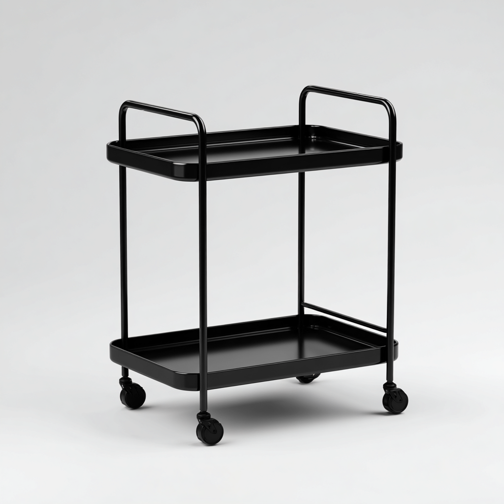 Der Wagen besteht aus einem schwarzen Metallrahmen mit zwei Ablagen aus robustem Material. Das schlichte Design fügt sich ideal in moderne Küchen oder Essbereiche ein.