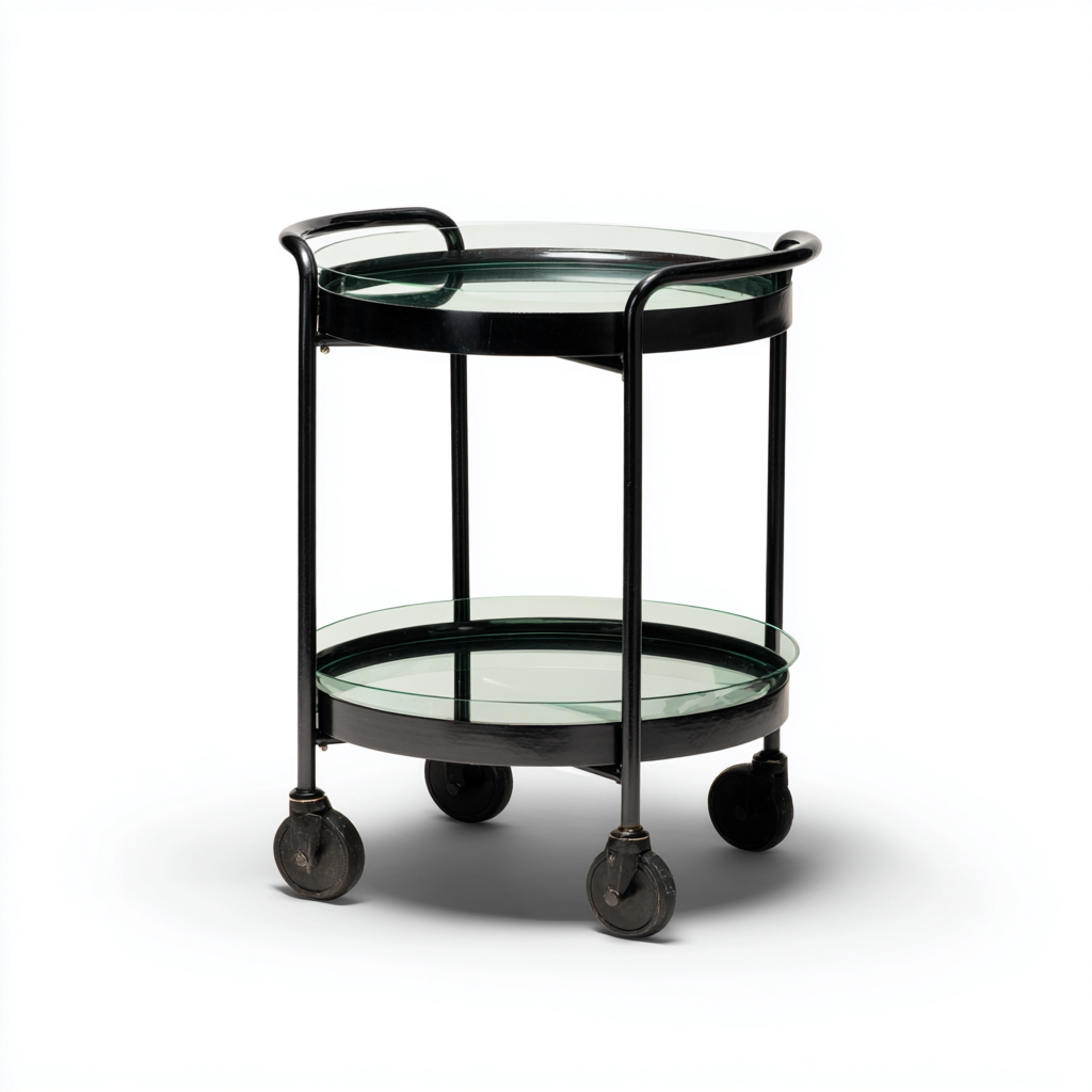 Dieser runde Küchenwagen kombiniert eine stabile Metallkonstruktion mit klaren Glasablagen und überzeugt durch seinen eleganten, minimalistischen Stil. Die beiden Ablageflächen bieten praktischen Platz für Getränke, Geschirr oder Servierutensilien.