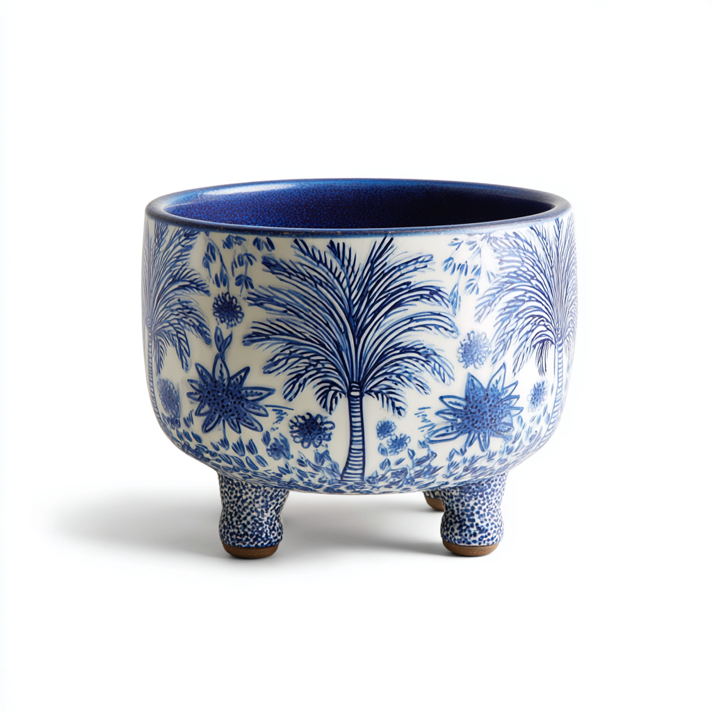 Dieses dekorative Pflanzgefäß besticht durch sein kunstvolles blau-weißes Muster und die elegante Fußkonstruktion. Es eignet sich ideal für den Innenbereich und setzt Zimmerpflanzen stilvoll in Szene.