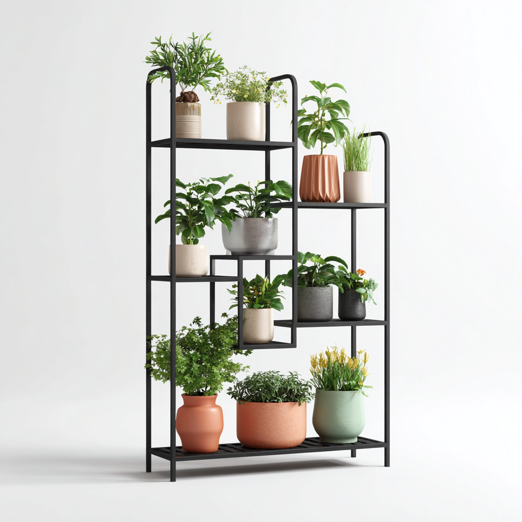 Die mehrstufige Struktur bietet Platz für mehrere Pflanzgefäße, erleichtert die Pflege und schafft gleichzeitig eine dekorative vertikale Grünfläche.