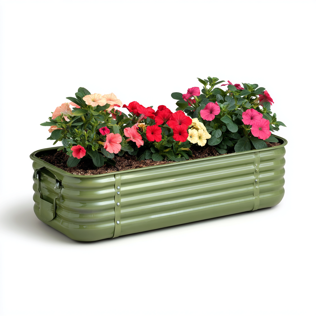 Dieses Pflanzgefäße zeichnet sich durch seine moderne, längliche Form und die robuste Metallkonstruktion aus. Es eignet sich ideal für Balkone, Terrassen und Gartenbereiche.