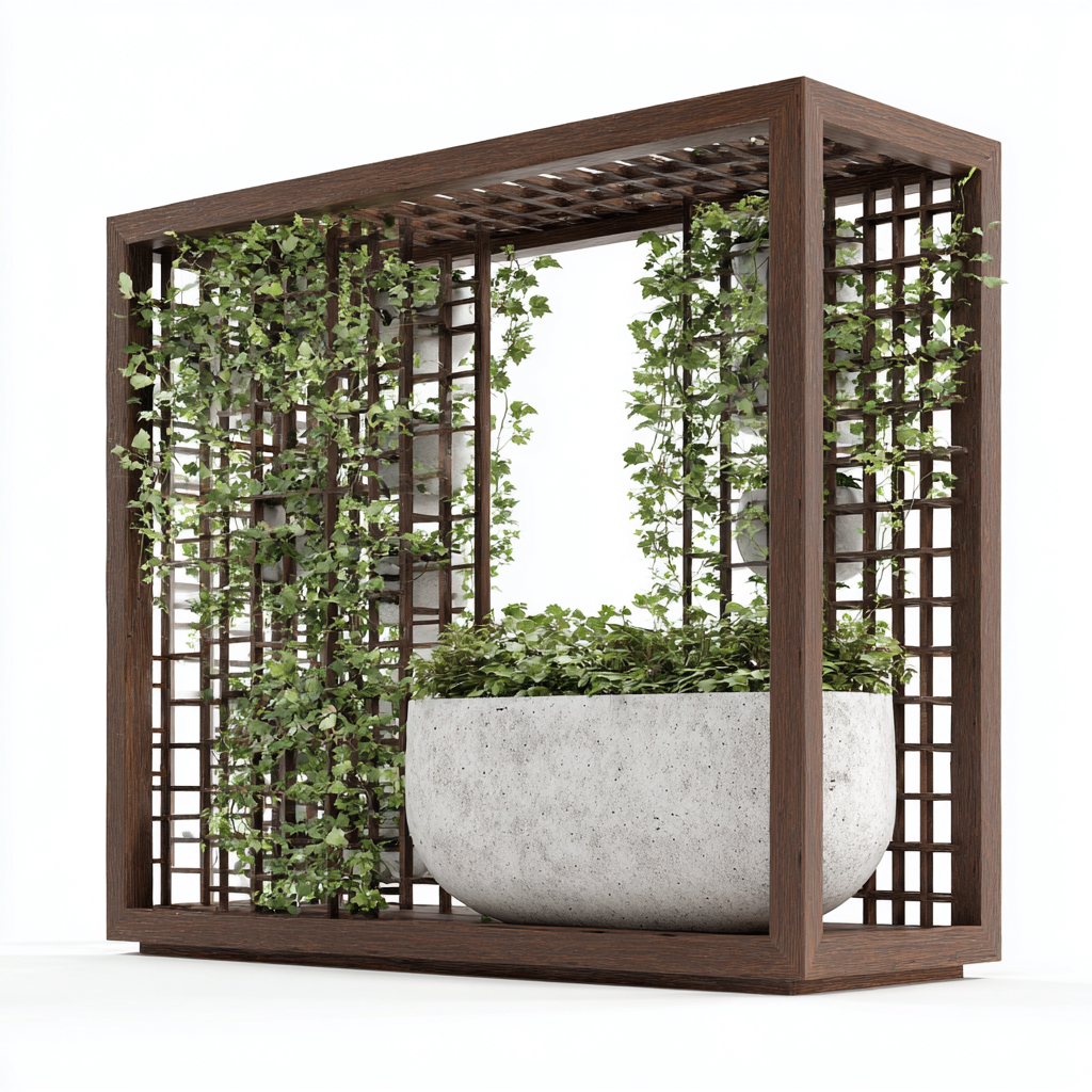 Der äußere Rahmen besteht aus braunem Holz mit klarer Linienführung. Die Pflanzwanne ist aus grauem Stein gefertigt und bietet Platz für üppige Bepflanzung. Die integrierten Rankgitter ermöglichen das Wachstum von Kletterpflanzen und erzeugen eine lebendige grüne Wand.