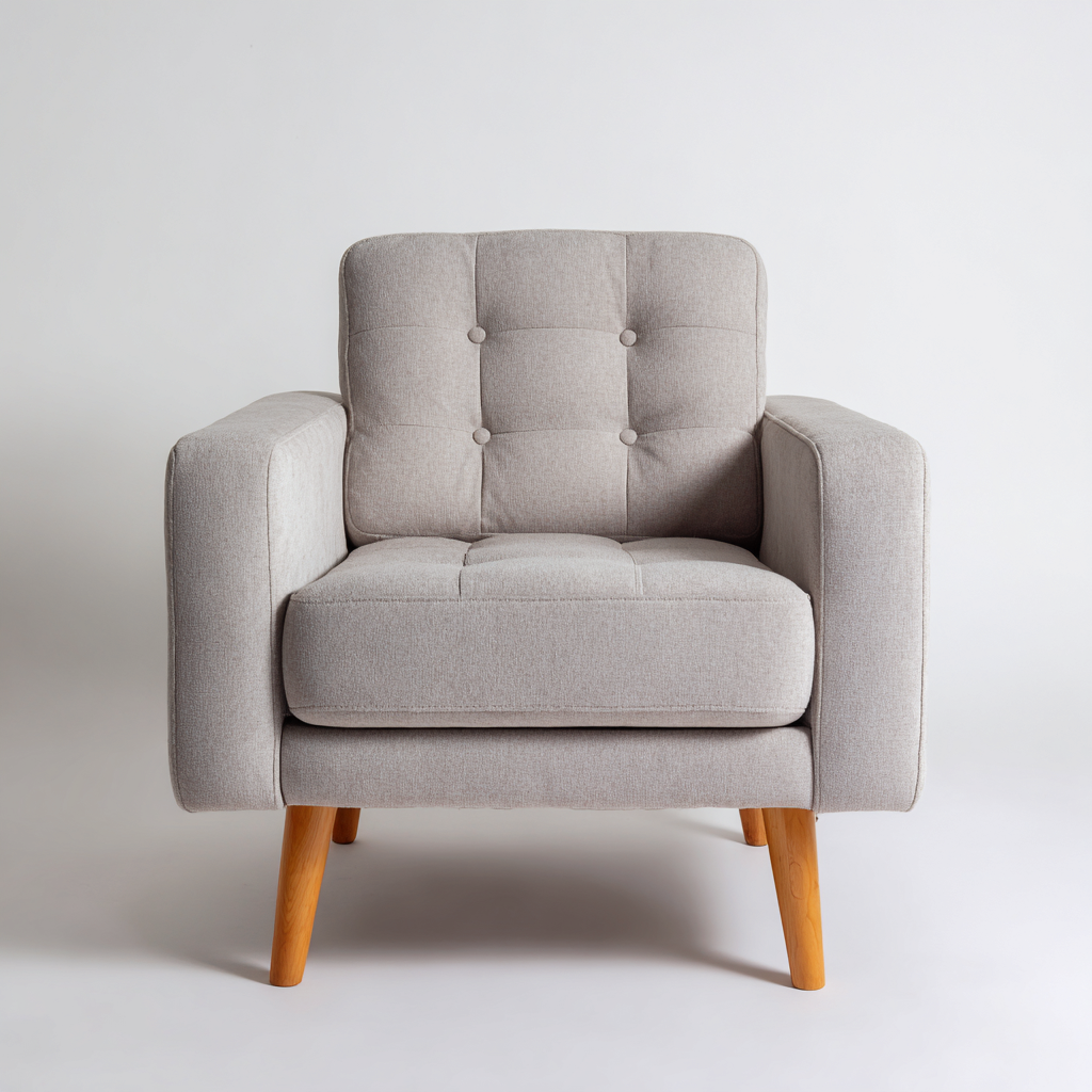 Dieser Sessel präsentiert sich in einem modernen, klaren Design mit einem warmen beigefarbenen Stoffbezug. Die Knopfheftung auf Rücken- und Sitzkissen verleiht dem Möbelstück eine dezente Struktur und sorgt gleichzeitig für ein harmonisches Gesamtbild.