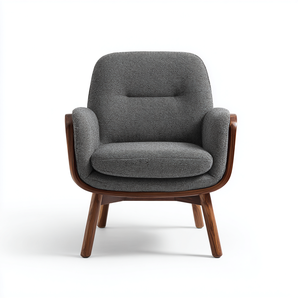 Dieser Sessel kombiniert moderne Polsterung mit einem formschönen Holzrahmen in Walnussoptik. Die weichen Rundungen und die ausgewogene Proportionierung verleihen dem Möbelstück eine warme, einladende Ausstrahlung, ideal für Wohn- und Loungebereiche.