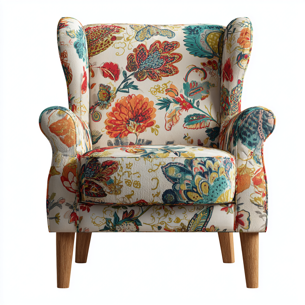 Dieser Sessel kombiniert ein klassisches Design mit einem auffälligen, mehrfarbigen Stoffbezug. Die geschwungenen Armlehnen und die hohe Rückenlehne verleihen dem Möbelstück eine elegante Form, die sich als dekoratives Highlight in verschiedenen Wohnbereichen eignet.