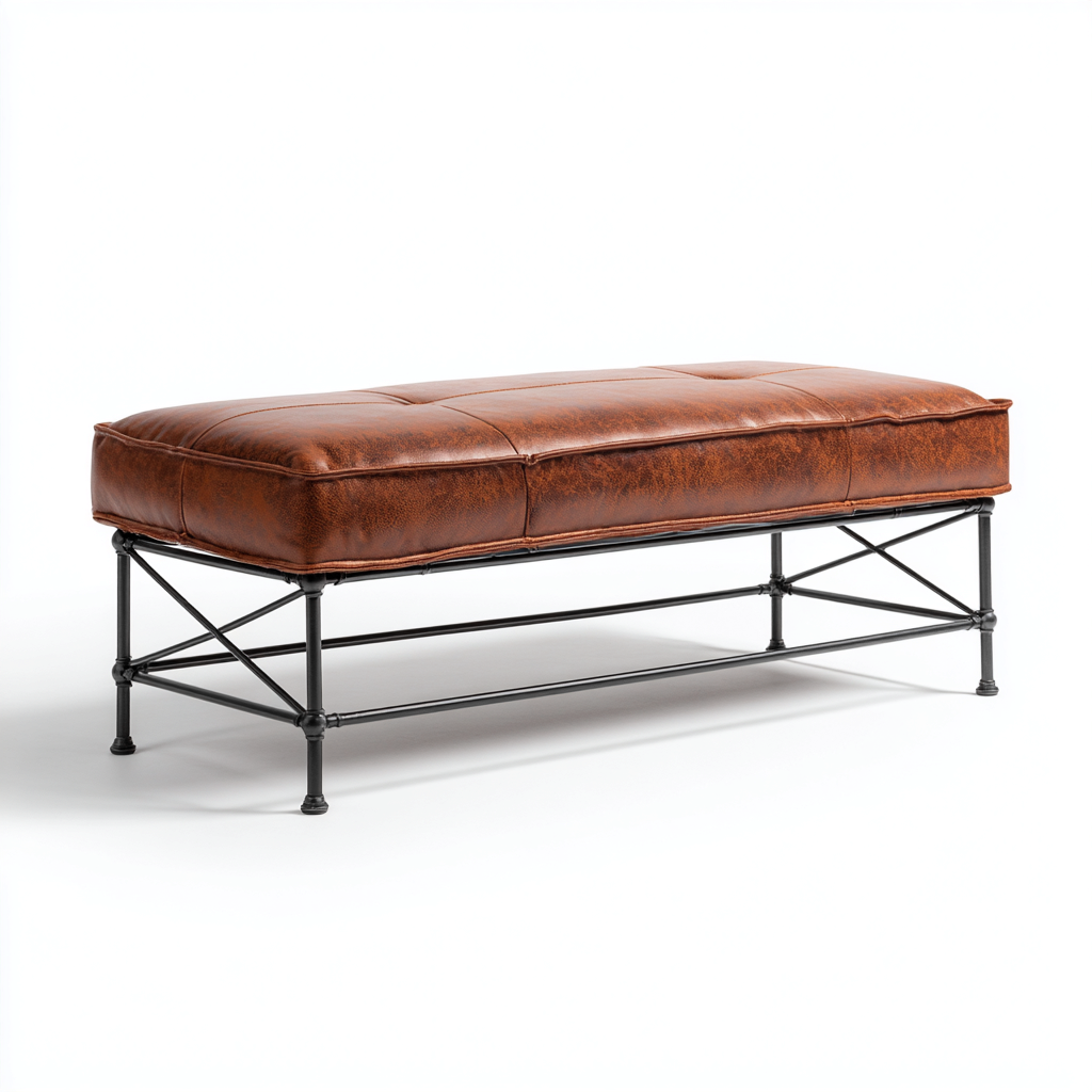 Die weich gepolsterte Sitzfläche besteht aus braunem Kunstleder, kombiniert mit einem robusten Metallgestell in Schwarz. Die Materialien sind langlebig und pflegeleicht.