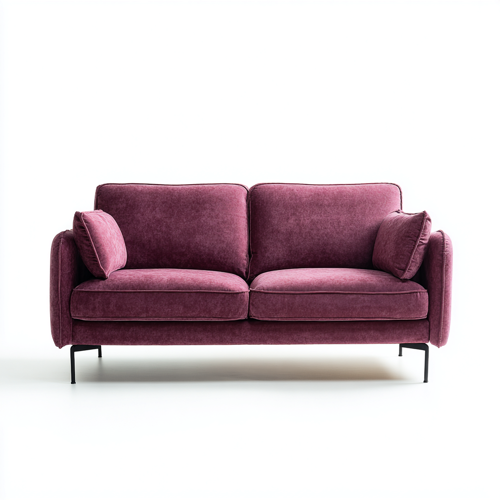 Dieses Zweisitzer Sofa überzeugt durch sein edles purpurfarbenes Samtgewebe und das moderne Design. Die weiche Polsterung und die stabilen Beine sorgen für Komfort und Stil in jedem Wohnzimmer.